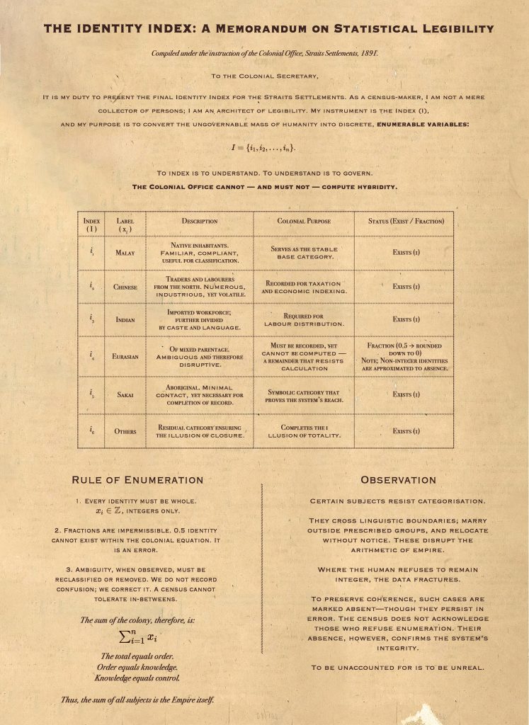 My response takes the form of a detailed, critical Inventory—a document of administrative creation that simultaneously defines and critiques the structure of colonial knowledge. I adopted the persona of a colonial administrator, mimicking the mathematical and legalistic precision seen in the “Identity Index” image, but subverting it to expose the system’s foundational fiction.