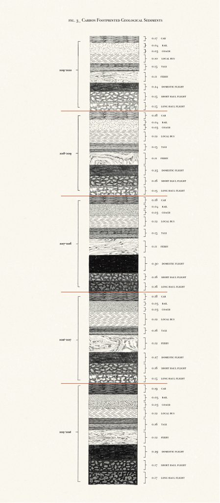 The hinge of the project is the barcode. A barcode does not recognise a person but it recognises a record. Before arriving physically, the student already exists administratively as data. Each scan logs an event. In geology, repeated events create sediment layers. Here, repeated administrative actions accumulate into emissions. The barcode is a machine-read record, and the sediment is an Earth-read record. When the airport scans the passenger, the Earth records the movement.