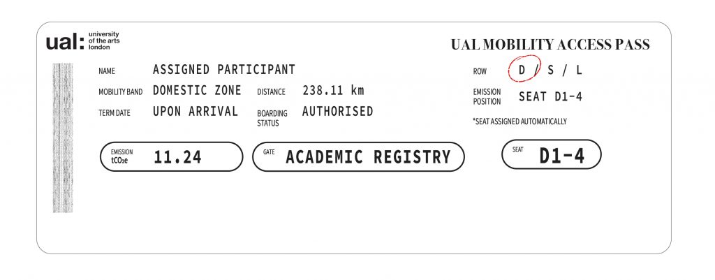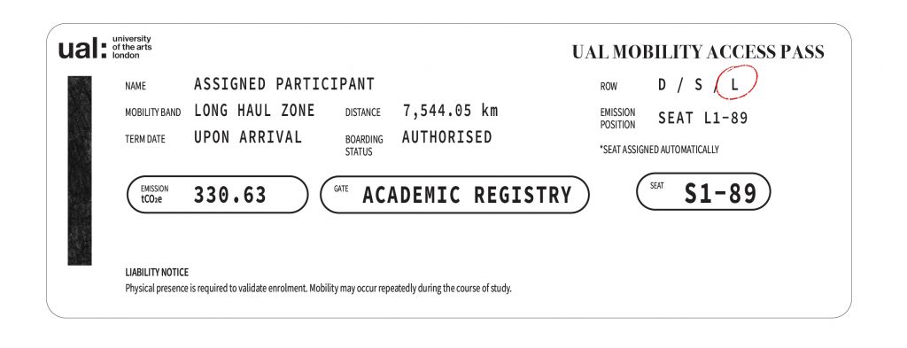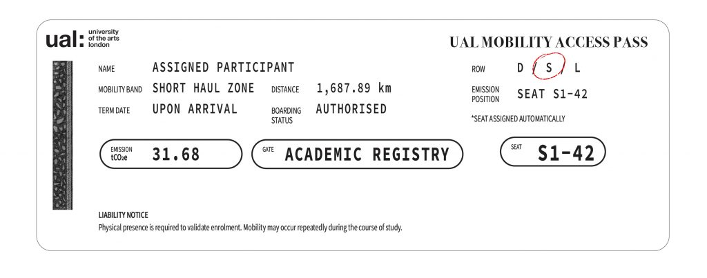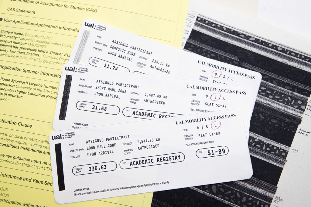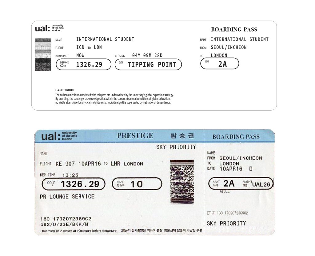 Then, we developed a ticket that no longer documents a trip but the condition under which travel becomes necessary. Students are assigned to Domestic, Short-haul, or Long-haul mobility bands, with emission and distance values calculated from the average CO₂ output of each category. Seats are automatically allocated, positioning the viewer within a ranked emission system while revealing that this position is structurally determined. The ticket therefore operates as a requirement for access to education rather than a personal travel choice, reflecting the repeated movement embedded in international study.