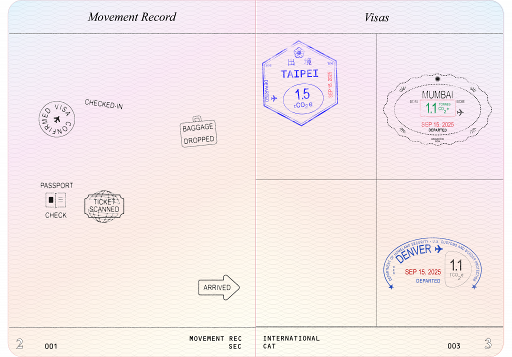 The Authorised Movement Passport tracks both personal and planetary movement. Instead of just “destination” stamps, we include the calculated CO2e emissions. It shows that movement is “Authorised,” not “Free.”