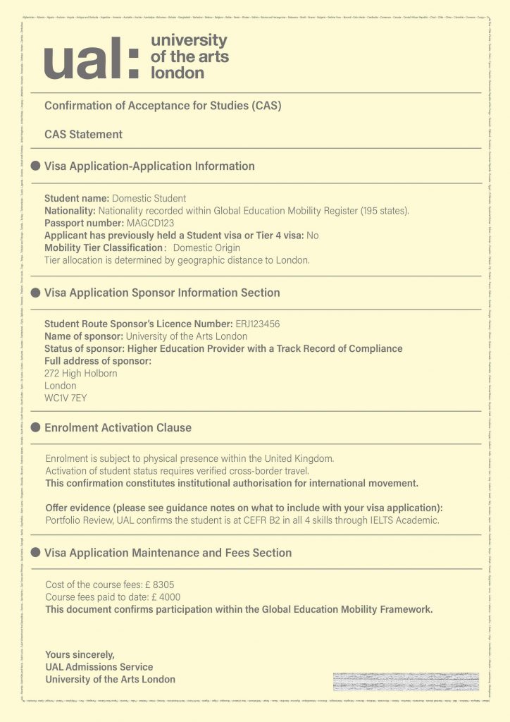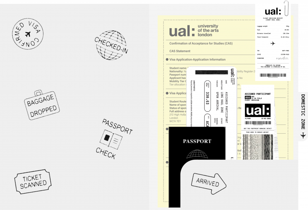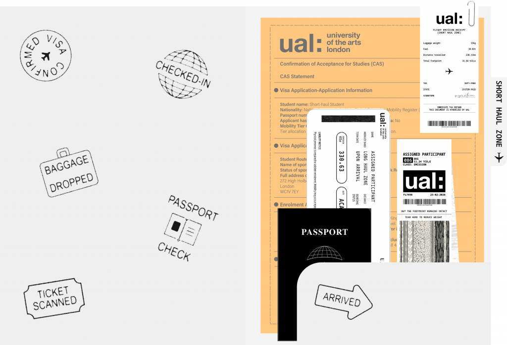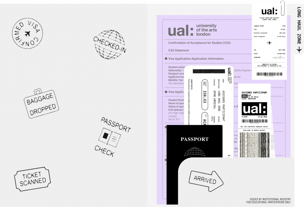 In our project, it is reframed as an authorisation record rather than an immigration document. It presents movement as a requirement for enrolment, not a personal choice. Personal identity fields are removed and replaced with system-based data, emphasising that the student is processed as part of an administrative structure. From the moment the institution issues this call, movement and emissions become structurally inevitable. The colour of the document follows a thermal intensity scale based on carbon output: long-haul students are marked in purple, while domestic students appear in yellow. Also, the 131 nation-states form a subtle boundary around the CAS letter. This visualises the geopolitical framework that authorises cross-border movement.