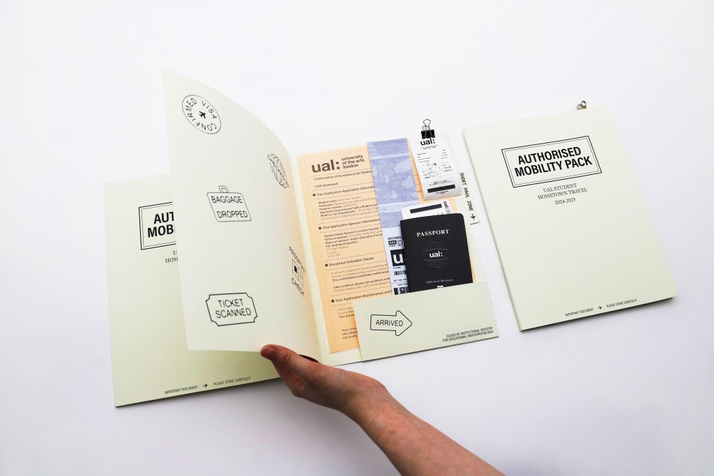 From this, we planned to develop an Authorised Movement Pack. Students are categorised into three movement bands — Domestic, Short-haul, and Long-haul — and each document represents a stage of processing. A block of barcodes tracks the progression, embedding a geological-sediment pattern so that every administrative step accumulates into a visible record of institutional movement and its emissions.